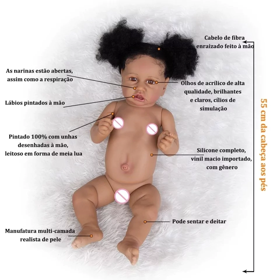 Cabelos implantados artesanalmente, fio a fio. Corpo em silicone 100% alemão, tornando-as ainda mais realistas.